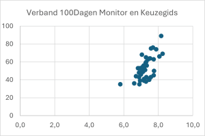 De uitkomsten van de 100Dagen Monitor blijken bovendien een goede voorspeller van bredere studenttevredenheid. Er is een duidelijke samenhang tussen het oordeel in de eerste honderd dagen en de uiteindelijke beoordeling van de opleiding in de Nationale Studenten Enquête (NSE) (zie de grafiek hiernaast). Daarmee is de monitor niet alleen een momentopname na honderd dagen, maar ook een instrument om tussentijds bij te sturen.