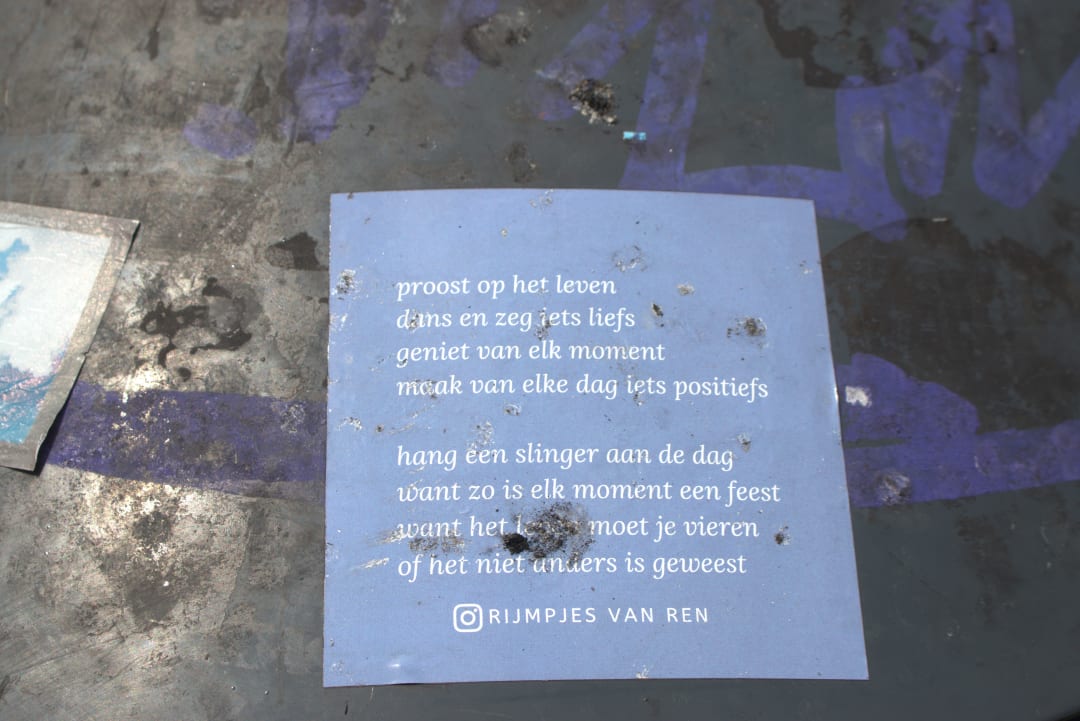 Na deze verborgen hiphopartiest loop je verder. Je wil even wat weggooien en dan zie je plots een gedicht. Geplakt op een prullenbak, bedolven onder wat vegen sigarettenas. Het is een rijm van Communicatiestudent Renske. De stickers laat ze achter onderweg naar studie en gaan over de dagelijkse dingen waar studenten zich misschien ook in kunnen vinden. Zoals brak zijn, geen motivatie hebben of de balans tussen studie, werk, vrienden en familie.