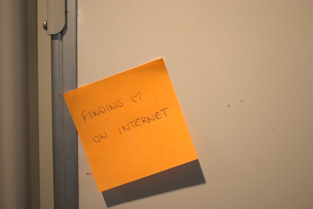 Is het een oproep? Advies? Een kreet uit een dagboek? Een behoefte? Of is het een onderwerp waar een student mee aan de slag is? Hoe dan ook: de schrijver van dit briefje in de ruimte waar de minor International Journalism wordt gegeven, is in ieder geval geïnteresseerd in het vinden van liefde via internet.