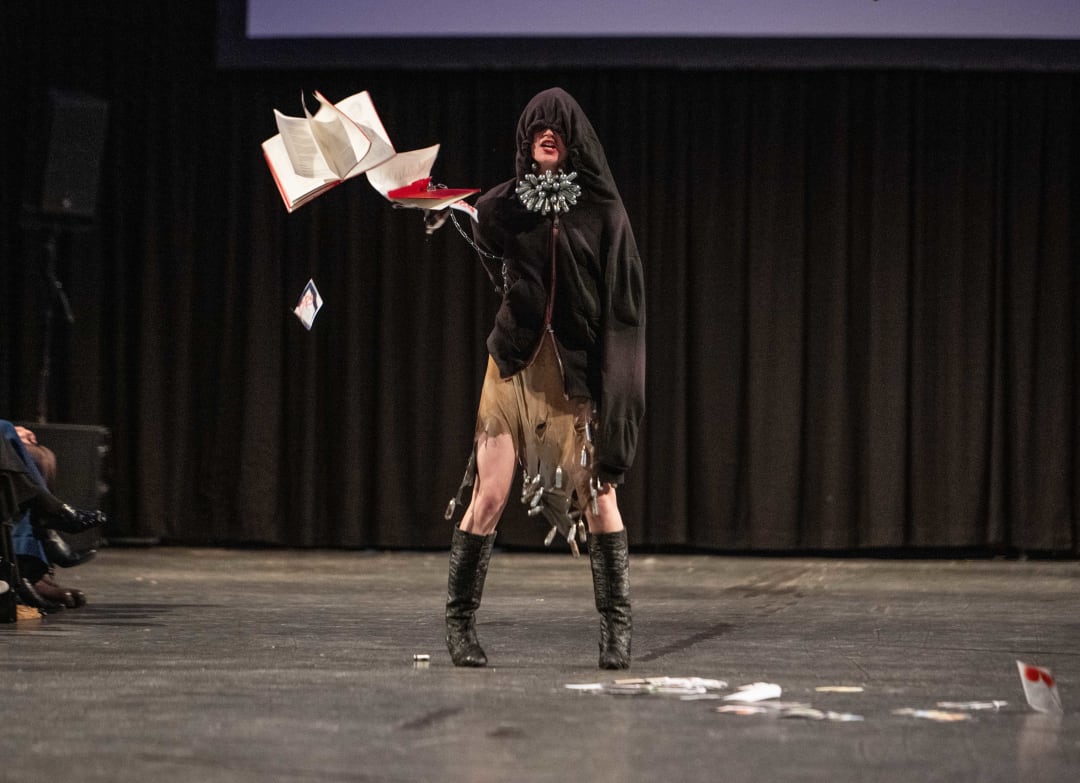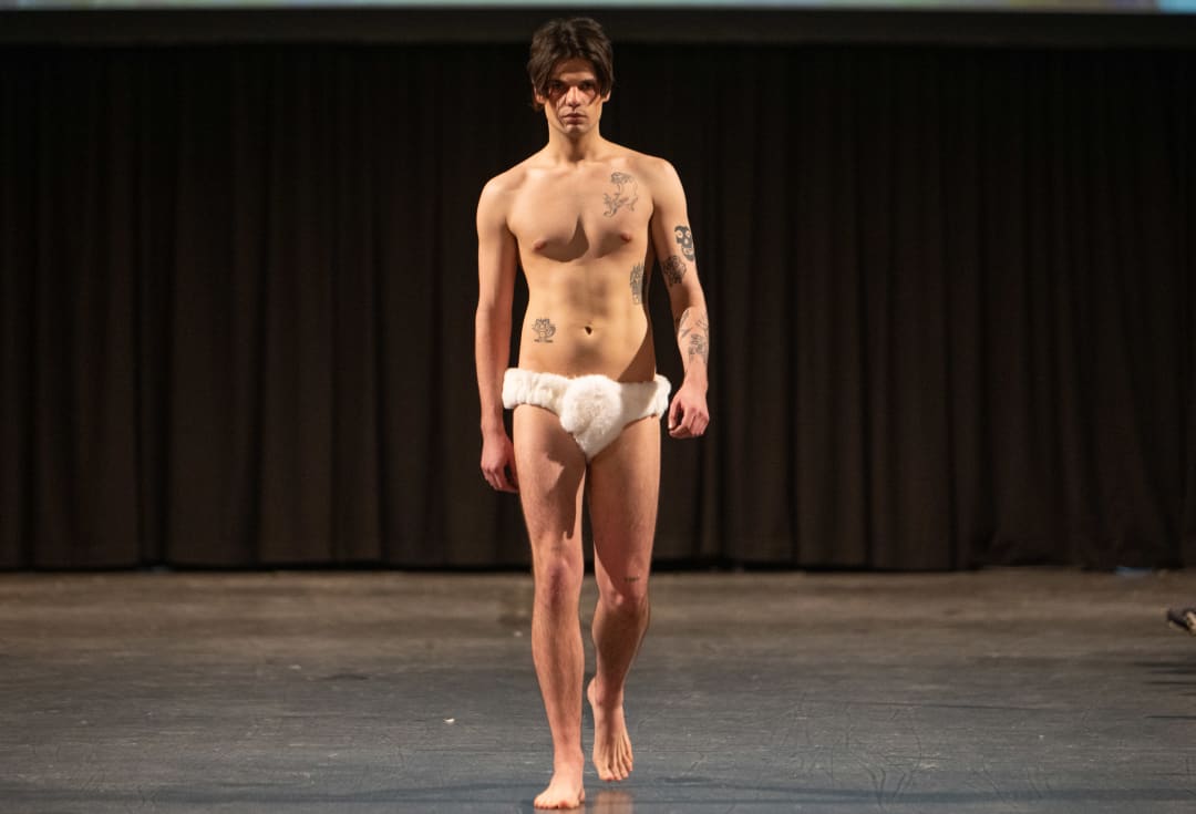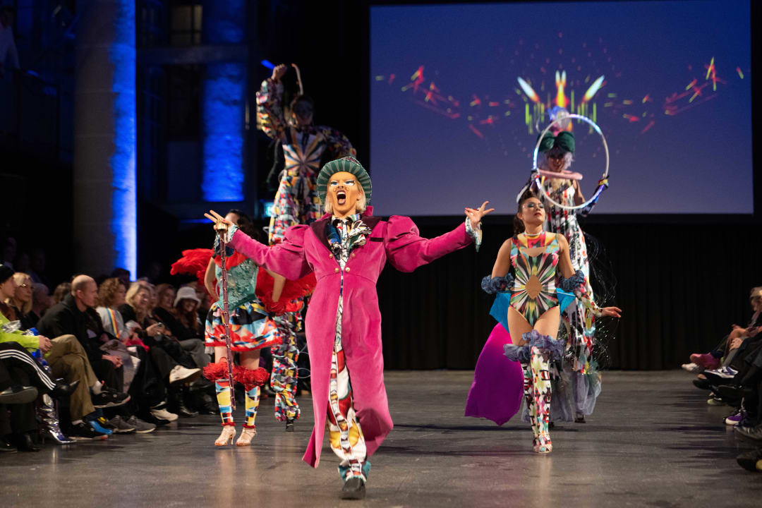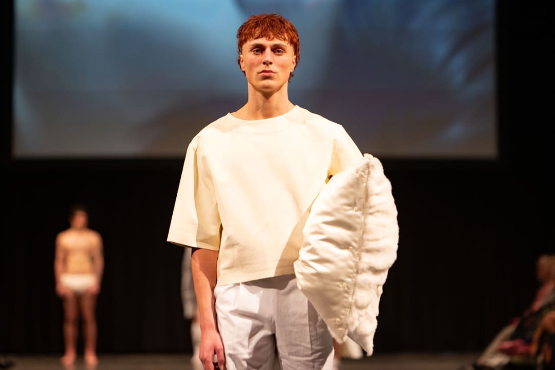 26 januari 2024Van spectaculaire designs op stelten, tot nietsverhullende broeken zonder billen en glitterklompen. Donderdagavond liep de Zuiderkerk vol studenten, familie en docenten voor de eerste Amfi Graduation Show van 2024.