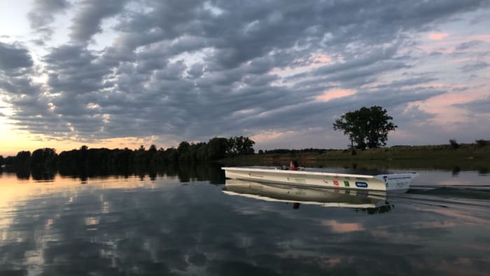 De HvA’ers varen deze week terug naar Amsterdam, met student Linda de Die (20, Product Design) aan het roer. ‘Ik stuur met de zonneboot over de rivieren, een normale boot vaart achter me mee voor de veiligheid. Tijdens de reis heb ik ook constant contact met de mensen die meerijden op de kant. Zij geven informatie door over hoeveel energie de zonnepanelen genereren, en hoeveel energie de boot vervolgens verbruikt. Zo drijven we niet ineens met een lege accu op het water.’