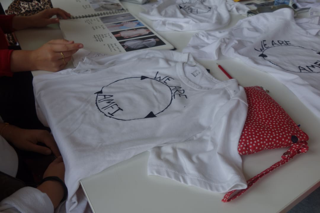 De klas is gemixt, met ongeveer twee derde vrouw en de rest man. Iedereen zit te werken aan een zelf meegebracht T-shirt. Verspreid over de tafels liggen stiften in allerlei kleuren. De opdracht is om samen met de klas een boodschap te formuleren met een logo en dit op de T-shirts te tekenen. Deze klas heeft gekozen voor de slogan ‘We Are Amfi,’ met daaromheen door een recycle-logo.