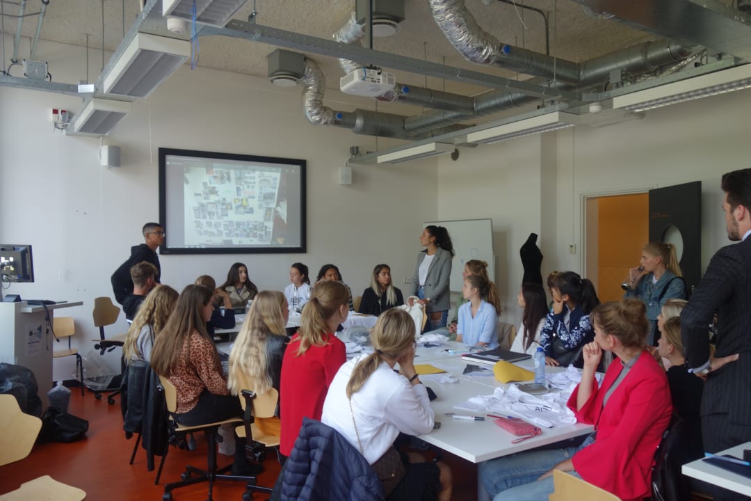 De klas wordt begeleid door een tweedejaars student. Bas Kort (20) zit voorin de klas bij de computer klaar om vragen te beantwoorden en de eerstejaars te helpen bij de opdracht. Ook hij studeert Fashion & Management. ‘De bedoeling van de opdracht is vooral dat ze leren samenwerken en elkaar leren kennen. Ik merk dat iedereen op zo’n eerste dag wat terughoudend is.’
