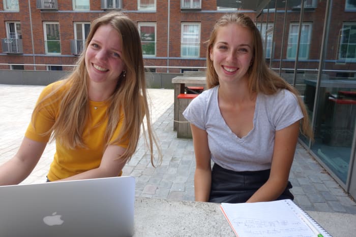 ‘Wij doen de minor Working in the English speaking world in het het Benno Premselahuis. Als het lekker weer is dan gaan we hier zitten studeren. Een fijn moment van de dag is als we van het ene naar het andere gebouw lopen en dan een cappuccino drinken. Dan lopen we, superontspannen, met de rest van onze klas hierheen.’