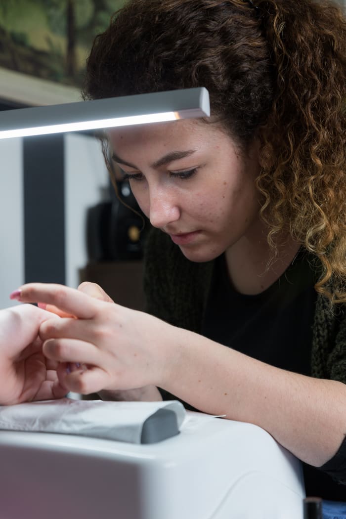 ‘Ik vind het sociale aspect heel leuk. Je bent ook een beetje een therapeut. Als mensen ergens mee zitten vertellen ze mij dat, omdat je toch een uur tot anderhalf uur tegenover elkaar zit. Ook vind ik het resultaat mooi. Je kan er op een dag nog zo slecht uitzien, je nagels shinen altijd.’