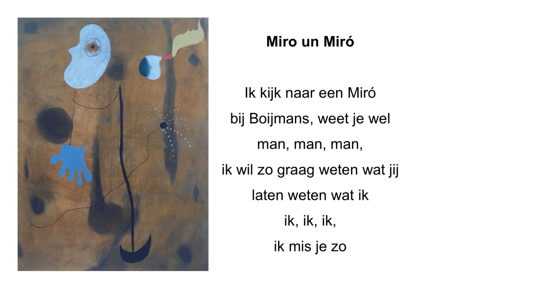 Starend naar een modern schilderij van kunstenaar Miro in het museum, kwam Boudewijn Scholten (Lerarenopleiding Nederlands,deeltijd) aan het begin van de coronacrisis op het idee voor zijn gedicht. ‘Opeens besefte ik dat ik met niemand kon delen wat ik zag. Ik mis gezelschap door de hele coronacrisis.’