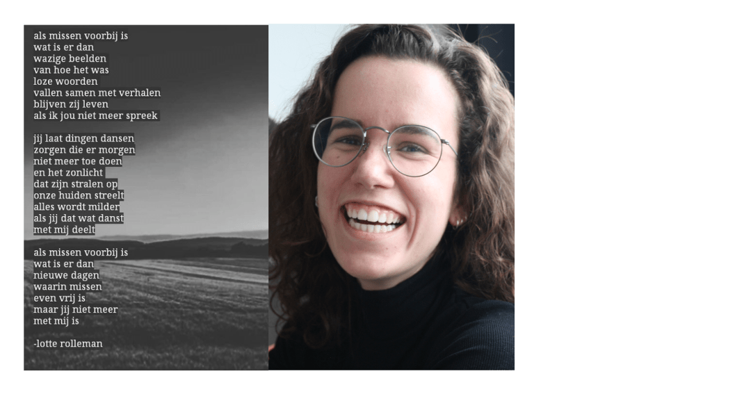 Anouk leverde haar gedicht in als spoken word om zichzelf uit te dagen. ‘Ik heb een Instagramaccount waarop ik al een aantal jaren korte gedichten deel. Hierbij ben ik gebonden aan een bepaald aantal woorden en een vaste opmaak, wat soms best beperkend is. Daarom besloot ik het nu totaal anders aan te pakken in de vorm van een video.’ En met succes: ze won met haar voordracht de derde prijs.