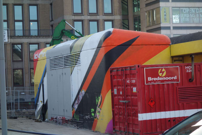 De door het Duitse streetartcollectief Lackaffen gemaakte kleurrijke portretten op de voor- en achterkant van het gemaal op het bouwterrein naast het Kohnstammhuis zijn door bouwvakkers keurig overgeschilderd met muisgrijze verf. ‘Dat is inderdaad gedaan uit respect voor de beeltenis van Anne Frank,’ vertelt Esther Purmer van de HvA.