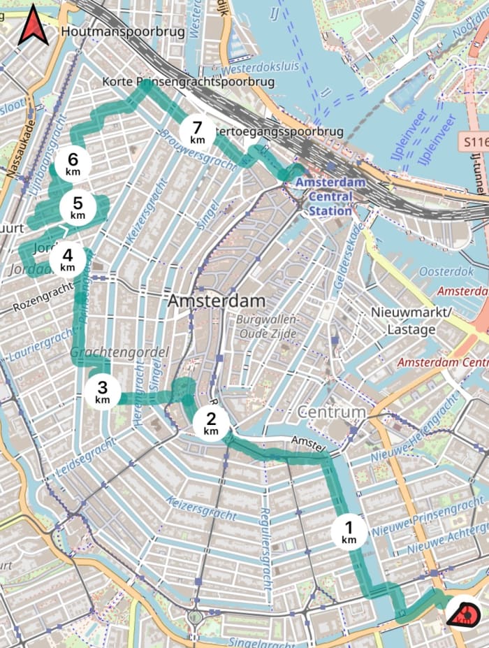 Route: De route begint bij de Amstelcampus. Je loopt via de Amstel naar het Begijnhof. En daarna de Jordaan in vanaf de Prinsengracht. De route eindigt bij het Centraal Station.
