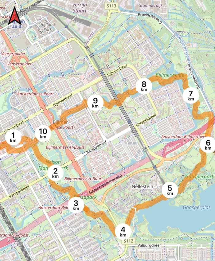 Route: Je kunt starten vanaf station Bijlmer, richting Nelson Mandelapark waar je helemaal doorheen loopt. Daarna naar het natuurgebied bij de Gaasperplas. Vanaf de plas loop je weer terug via het Gaasperpark en de Bijlmerweide. De laatste twee kilometer loop je langs flats, maar het blijft verrassend groen.