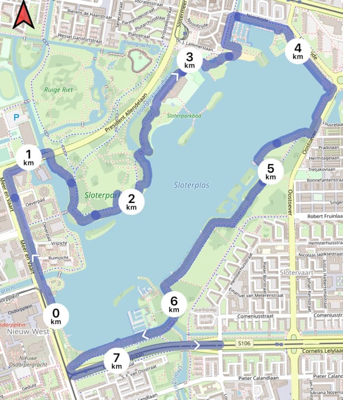 Route: Bij de sportcampus loop je het Sloterpark in en vervolgens een rondje Sloterplas. Het park is groen met open en beboste delen. In de zomer is het vol met zwemmers, zeilers, duikers en vissers. Je eindigt bij de sportcampus óf je neemt de tram op de Cornelis Lelylaan.