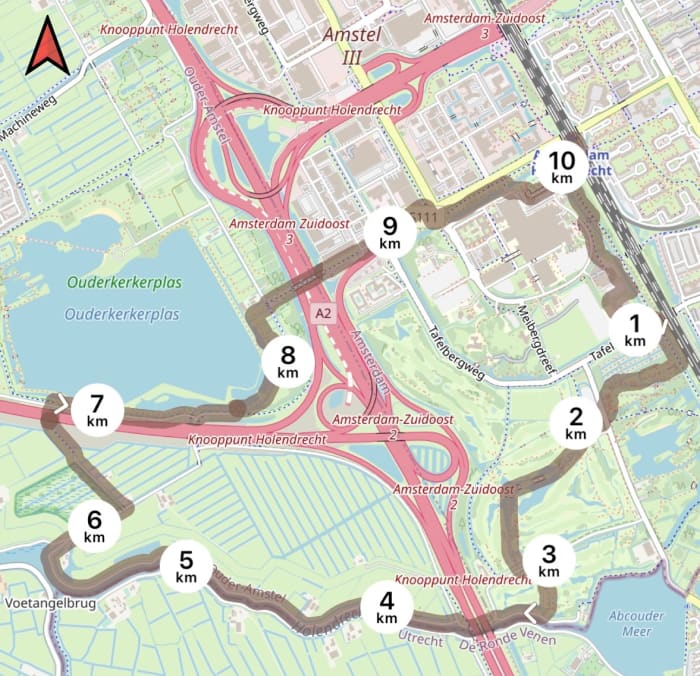 Route: Vanaf de Gezondheidscampus kun je eenvoudig via bruggetjes en langs boerderijen richting de provincie Utrecht wandelen. Na het eerste stuk door het oude natuurgebiedje De Ruige Hof loop je via golfterreinen naar de rivier Holendrecht. Je kunt aan twee kanten lopen: er is een zelfbediendingspont bij Abcoude. Je volgt de rivier tot de Ouderkerkerplas. Vanaf daar loop je in een rechte lijn terug naar station Holendrecht.