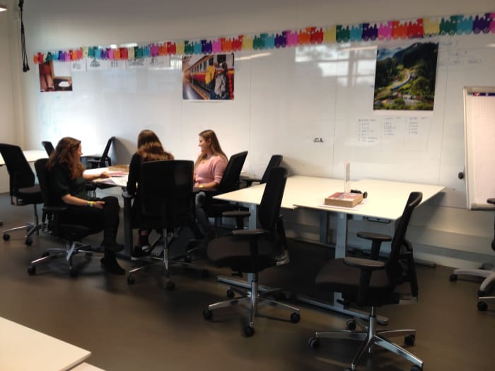 In groepjes van twee à drie werken deze studenten aan een lastig probleem. Hoe kunnen ze reizen met de trein zó aantrekkelijk maken dat reizigers de trein verkiezen boven het vliegtuig?